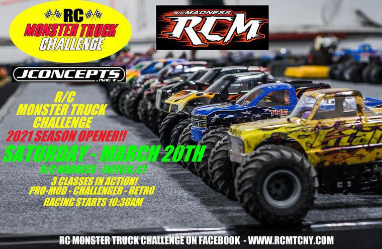 THE WILDEST SHOW IN RADIO CONTROL GETS READY TO GO BIG IN 2021!!! - After a challenging year in 2020, the RCMTC was able to put together an awesome racing year. Now, we're ready to come back in a BIG way!! Three Monster Truck Classes, challenging tracks, new competitors and veteran competitors ready to kick it up a notch will make up a wild 2021 racing season. All culminating in the wildest RCMTC World Finals we have ever had. The battle for the biggest R/C Monster Truck Points Championship starts off on March 20th indoors at RC Madness in Enfield, CT. Three classes of monsters will be in action and we cant wait to get to the track and get this 2021 season kicked off. You don't want to miss any RCMTC racing action this year!! So get those trucks ready, it's time to ROCK!!