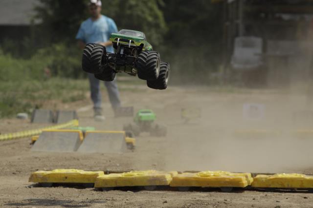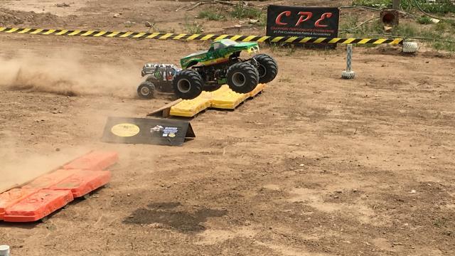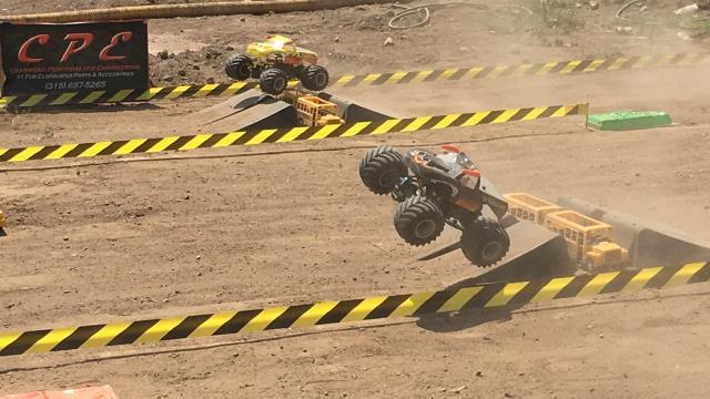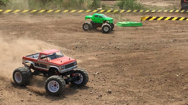 The 2016 RC Monster Truck Challenge Points Series is in full swing and this time the monsters had nice hot weather and perfect track conditions for the Round 4 racing event. The original plan was to run an S-course but the track was changed to an exciting side by side USA Motorsports style turning drag. The trucks would start off over a big roller jump which would throw the drivers a curveball right off the start, then drag to a middle jump, both making left hand U turns and jump over a set of school busses, make another left handed U turn, hit the middle jump again and drag to the final jump and fly over the finish.