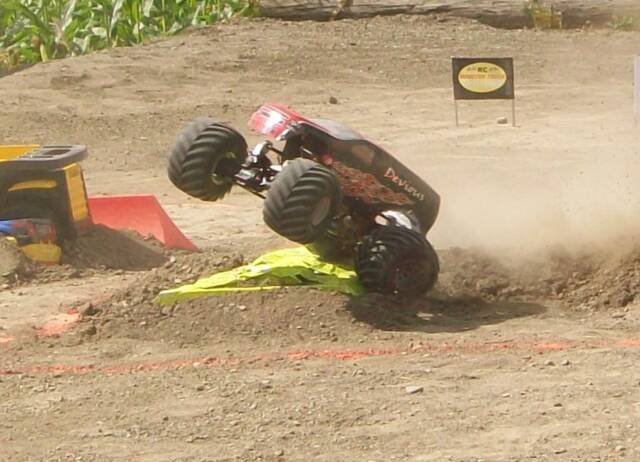 FREESTYLE- This year's field was the most competitive freestyle lineup of trucks the Barnstormers RC Raceway has ever seen, and it was an awesome night of freestyle. The trucks tore up the freestyle course, grabbing huge air, big wheelies and big crashes. Highlight runs belonged to Revolution, Airforce Afterburner, Maximum Destruction, Big Red and others, but the freestyle night belonged to Greg Noonan. After running into problems with Cant Stop Rockin', Bigfoot and Wolverine, Greg brought out Bounty Hunter and pulled off a wicked freestyle. Greg's run included the move of the night which occured when Greg went to hit the big container stack from the back side. Bounty Hunter pulled a backflip in mid air and landed on all fours on top of the container stack and continued to drive down the stepped side, an incredible move! Greg Noonan and Bounty Hunter was given the highest score and would claim the RC Monster Truck Challenge World Finals freestyle championship!!!! Congrats goes out to our second new champion, here are some pics from the freestyle event.